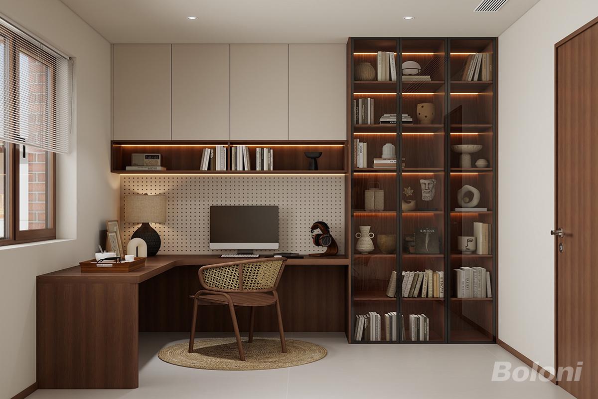 最大化利用墙面空间,提供充足的操作与收纳区域,一侧靠窗保证自然采光,适合长时间办公与阅读。 左侧为封闭式吊柜 + 开放式洞洞板 + 灯带层板,右侧为玻璃门高柜,兼顾展示与隐藏收纳,让空间整洁有序。