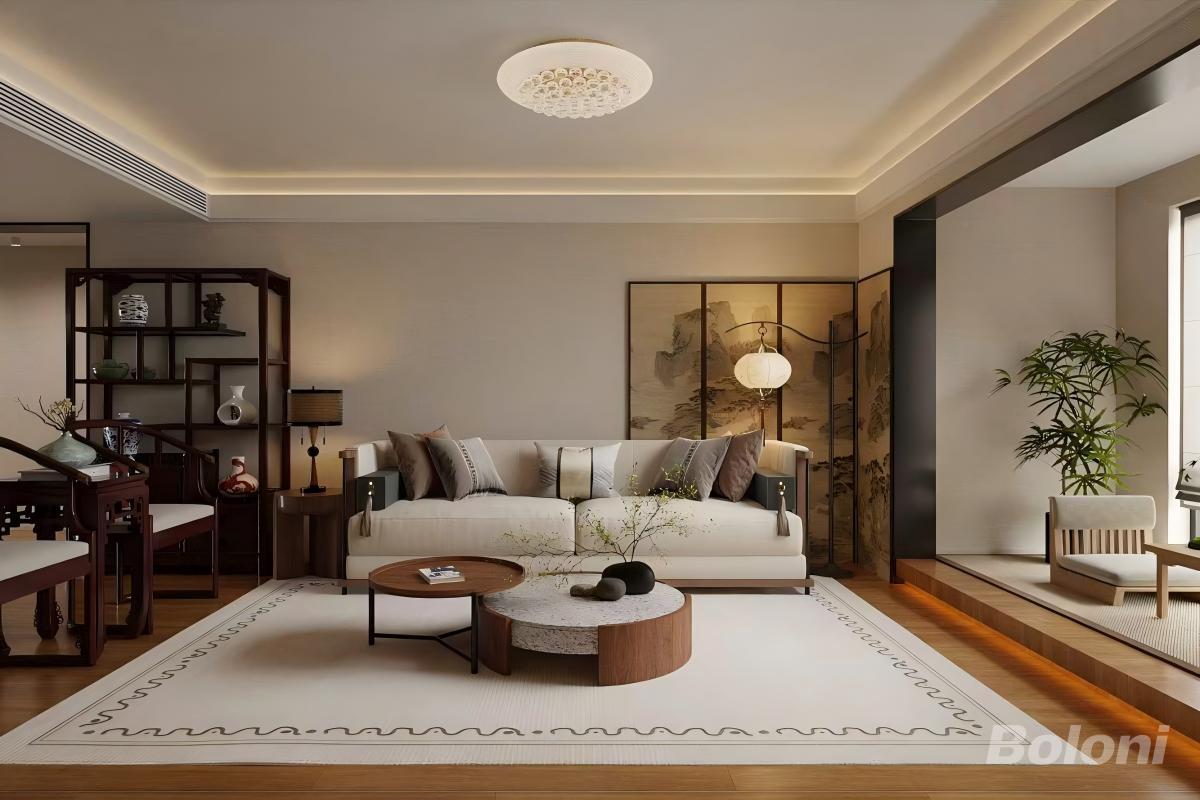 中心会客区:围合式沙发布局,聚气安稳,适合家人团聚与待客; 文化展示区:博古架+山水屏风,承载收藏与东方意境,提升格调; 休闲过渡区:侧区预留松弛角落,兼顾阅读、品茶与观景; 动线流畅开阔,功能分区清晰,实现传统礼序与现代生活兼容。