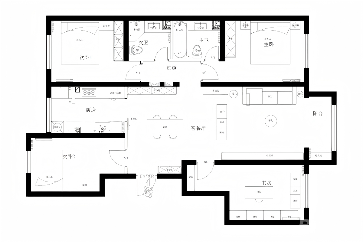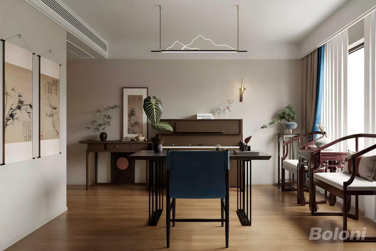 以“文人书房的清寂与松弛”为情绪核心,通过低饱和色调、自然光影与中式器物,营造“闹中取静”的精神庇护所,弱化空间的功利感,强化“手不释卷、琴音伴读”的雅致氛围,让书房成为安放自我、沉淀思绪的理想场域。