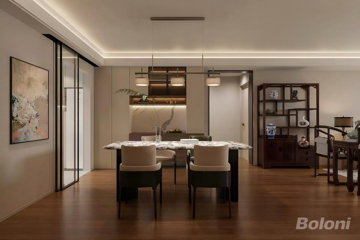 照明层次:采用“无主灯+线性吊灯+局部灯”的分层设计,顶面线性灯提供基础柔光,餐桌三头吊灯聚焦用餐区域,餐边柜暗藏灯带强化展示氛围,暖光色温(2700K-3000K)营造温润治愈的用餐氛围;