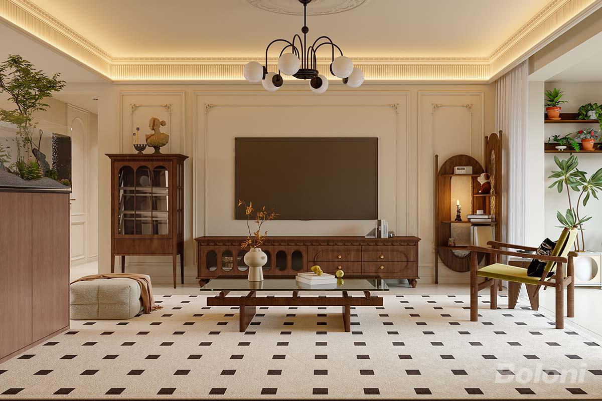 该电视背景墙以奶油色护墙与复古木作勾勒优雅基调,黑白格地毯与球形吊灯增添精致感,绿植与复古摆件点缀其间,营造出温润慵懒、浪漫雅致的氛围。