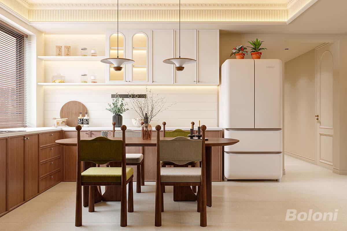 这间轻法风餐厨以奶白与胡桃木碰撞,弧形玻璃柜与复古吊灯点缀,开放式布局通透温馨,绿植与暖光交织,营造出治愈又雅致的用餐氛围。