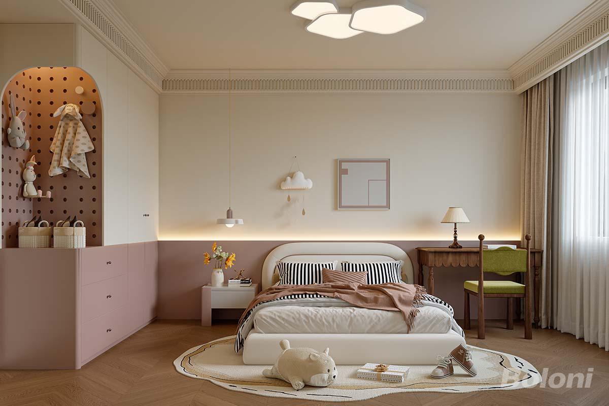 这间儿童房以温柔粉与奶油色拼接,弧形洞洞板充满童趣,软包床与不规则地毯营造安全感,复古书桌与柔和灯光,打造出治愈又充满想象力的成长空间。