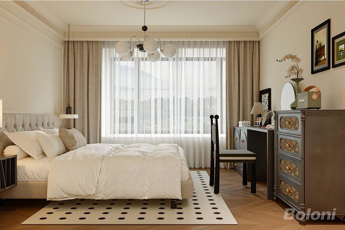 奶油色软包床头裹着松弛感,球形吊灯晕着暖光,波点地毯跳脱又可爱。阳光穿过纱帘漫进来,连呼吸都变得柔软,是能让人瞬间卸下疲惫的法式温柔梦乡。