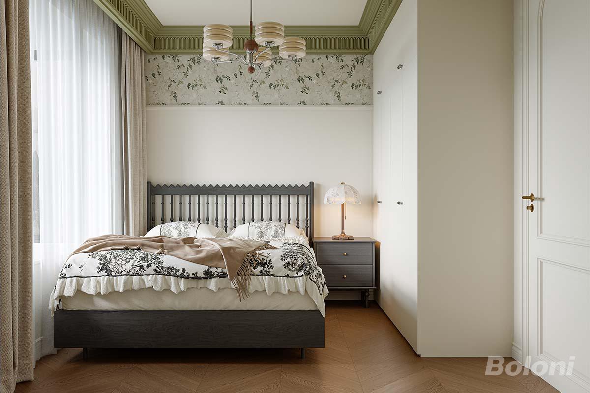 这间老人房以橄榄绿护墙与植物壁纸营造静谧感,深灰竖条床架搭配素雅床品,复古吊灯与柔光台灯,温润木色与柔和色调交织,尽显沉稳雅致的舒适氛围。