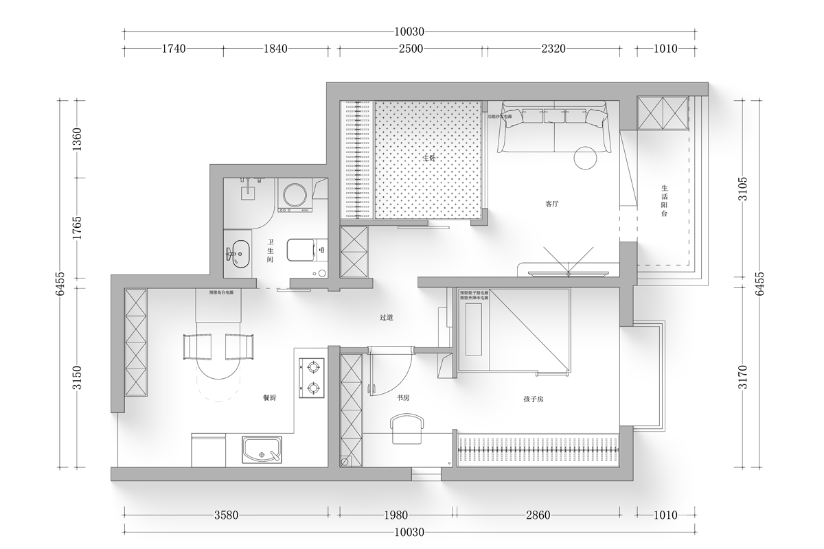 本设计采用简约风格,空间平面布局注重功能性与流畅性。入口即达餐厨区域,方便日常起居与用餐。客厅与生活阳台相连,保证充足采光与通风。主卧空间规整,配备独立收纳区域,提升居住舒适度。孩子房与书房相邻,便于孩子学习与休息,同时设置兴趣空间。卫生间干湿分离,提高使用效率。整体布局中,各功能区既相互独立又紧密联系,动线合理,减少空间浪费,以简洁的布局和实用的设计,打造出舒适宜居的生活环境。