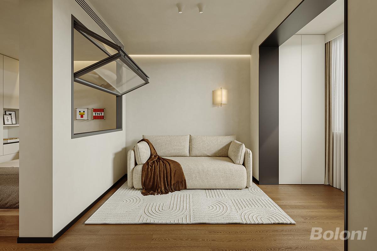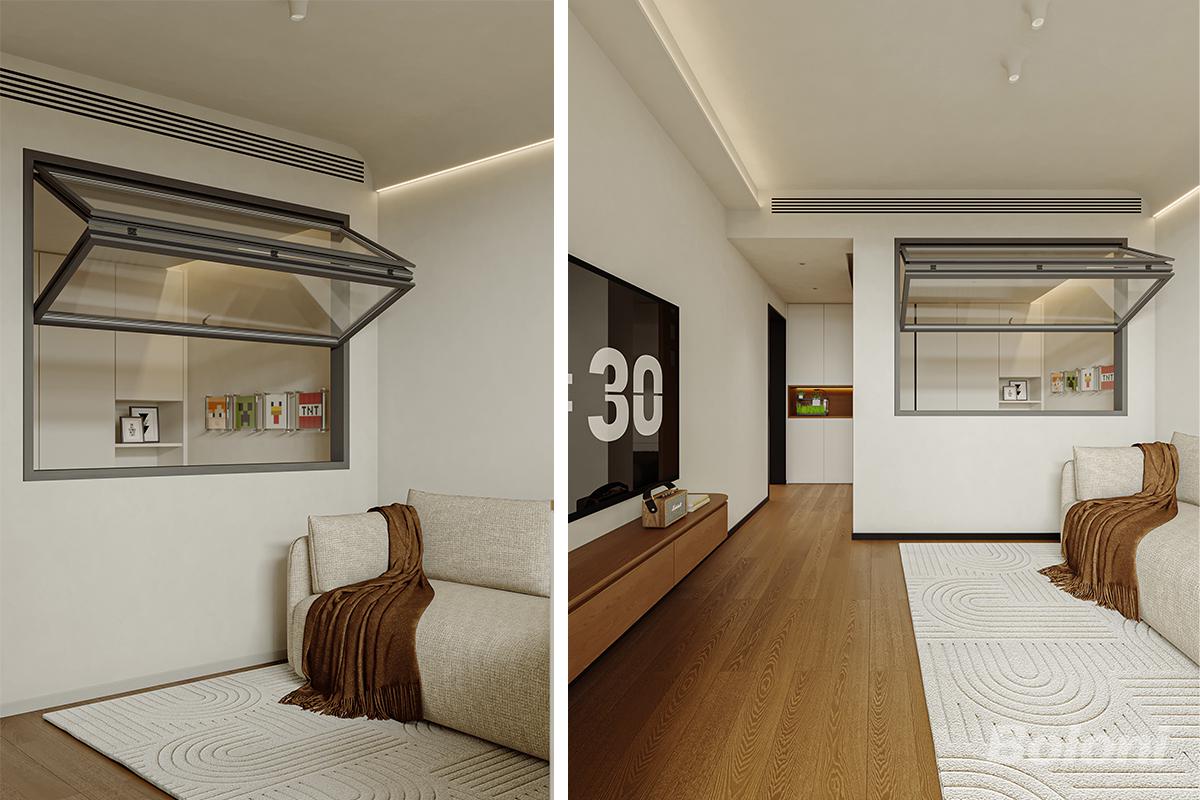 客厅秉持简约风格设计理念,整体给人简洁、舒适的视觉感受。空间以米白与木色为主色调,自然温和。墙面干净利落,壁灯散发着柔和的光线,增添温馨氛围。浅米色的沙发造型简约,搭上一条棕色的毯子,为空间增添一抹暖意。地面铺有带有几何纹理的浅色地毯,丰富了视觉层次。一侧别出心裁地设置了一个内嵌式玻璃窗洞,既增加了空间的通透感,又带来独特的展示效果。整个客厅布局紧凑合理,以简洁的形式展现出实用与美观的完美融合。