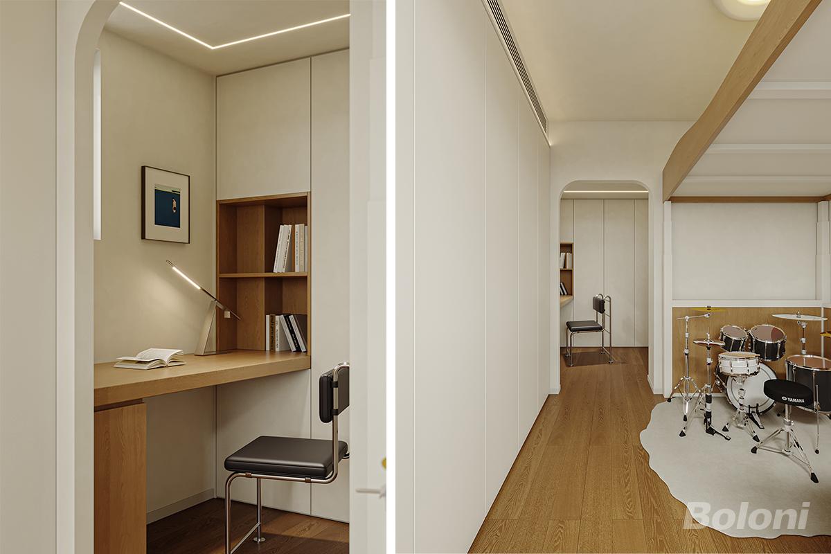 这间多功能房以简约风格呈现,巧妙融合实用与美观。空间以米白与木色为主色调,营造出温暖而宁静的氛围。入门处打造了嵌入式书桌与书架组合,书架开放式设计方便拿取书籍,书桌搭配简约的黑色座椅,满足工作学习需求。房间另一侧摆放着一套架子鼓,为兴趣爱好提供空间。墙面与天花板采用简洁的线条处理,无过多装饰。木地板增添自然质感,不规则形状的地毯柔化了空间。整体布局紧凑合理,在有限空间内实现了功能的多样化,尽显简约