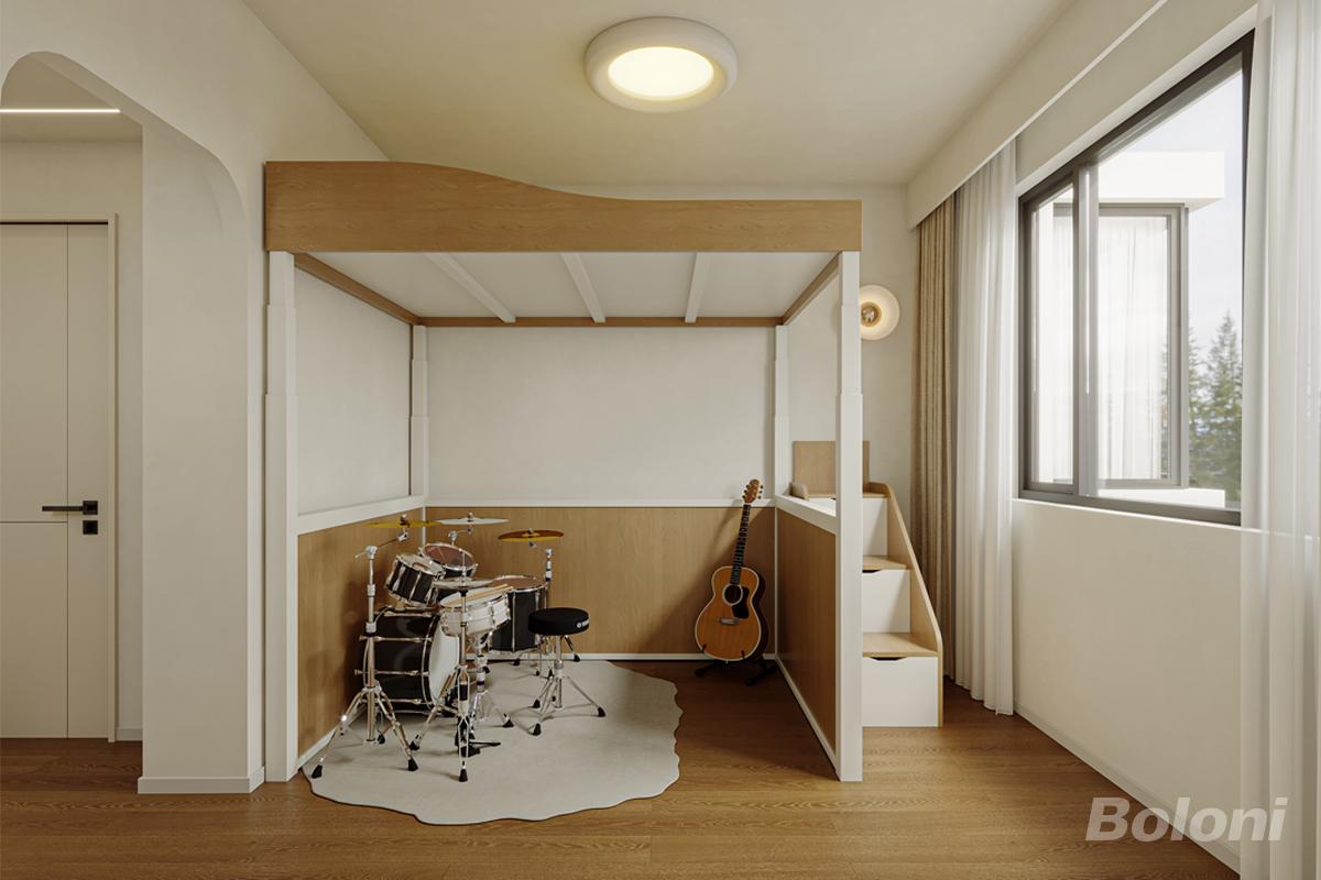 孩子房以简约风格设计,营造出温馨且富有活力的空间。整体色调以米白与木色为主,自然柔和。房间内设置高架床,下方空间巧妙利用,形成孩子的娱乐与兴趣区域。一套架子鼓和一把吉他摆放其中,为孩子提供发展爱好的天地。床侧的楼梯设计成抽屉式,增加收纳功能。大窗户引入充足自然光,使房间明亮通透。圆形吸顶灯提供均匀柔和的照明。整个房间布局紧凑合理,在简约的设计中,充分满足孩子的生活与成长需求,充满童趣与实用性。