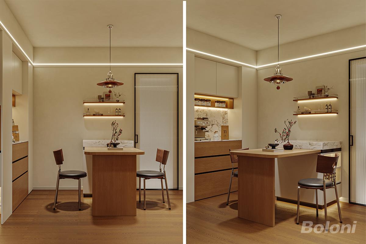 餐厅以简约风格打造,营造出温馨且利落的用餐氛围。整体色调以暖米色与木色为主,自然质朴。墙面与天花板衔接处嵌入灯带,提供柔和的间接照明,增添空间层次感。木质餐桌造型简洁,搭配两把金属与木质结合的椅子,实用又美观。墙上设置开放式搁架,内置灯带,既可展示装饰品,又能收纳物品。一盏独特的吊灯垂落于餐桌上方,成为视觉焦点。背景处的柜体设计兼顾收纳与操作功能,大理石台面更显精致,整体空间简约而不失格调。