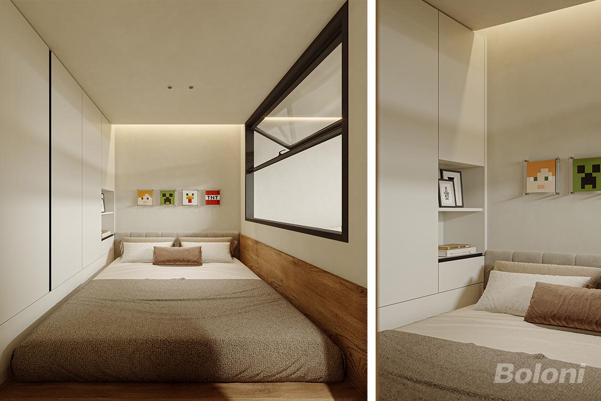 卧室以简约风格打造,呈现出宁静舒适的休憩氛围。空间整体以米白与木色为主,色调柔和温暖。定制的一体化柜体与床相连,充分利用空间,提供充足的收纳功能,局部的开放式搁架可摆放装饰品或书籍。床头背景墙简洁干净,上方悬挂几幅趣味挂画,增添活泼气息。大窗户引入自然光线,使室内明亮通透。无主灯设计,以隐藏式灯带提供柔和照明,营造出温馨的睡眠环境。整个卧室布局紧凑合理,以简洁的形式满足实用与美观的双重需求。