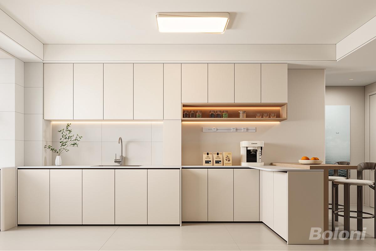 L 型 + 岛台布局:洗 - 切 - 炒动线清晰流畅,岛台延伸出吧台功能,既可以作为备餐区,也能兼顾轻食、咖啡休闲,实现 “厨房 + 社交” 双场景。 一体化收纳:通顶无拉手柜门设计,最大化利用垂直空间,隐藏杂物,保持台面整洁;开放格 + 灯带设计,方便展示常用调料与精致器皿,兼顾美观与实用性。整体采用柔和的米白 / 浅杏色柜体与墙面,搭配简洁的吸顶灯与灯带,视觉上干净清爽,没有繁杂线条