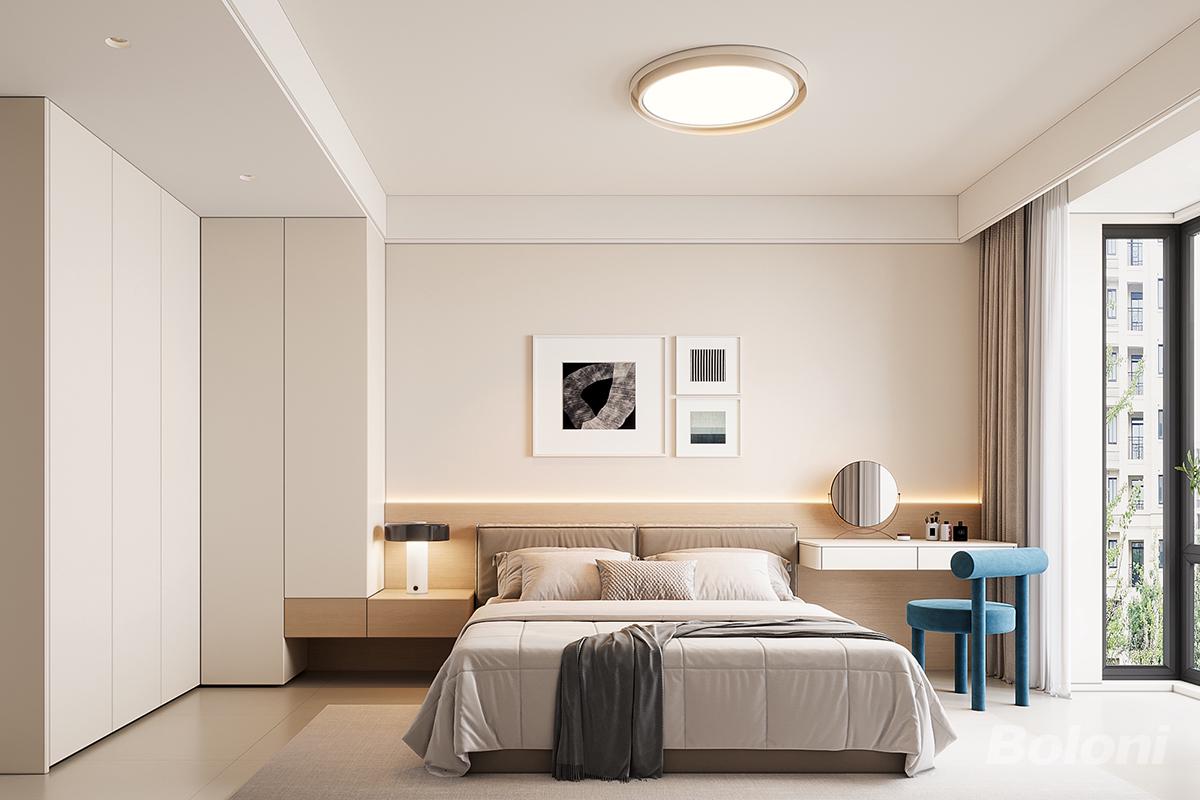 采光与通风友好:右侧大落地窗 + 双层窗帘设计,既保证充足自然采光,又能通过遮光帘营造优质睡眠环境;开阔布局利于空气流通,提升居住舒适度。 场景兼容性强:既适合核心睡眠需求,也能满足化妆、阅读、临时办公等多元场景,可塑性极强; 长期耐看性:经典极简奶油风不易过时,避免短期审美疲劳,适合长期居住。
