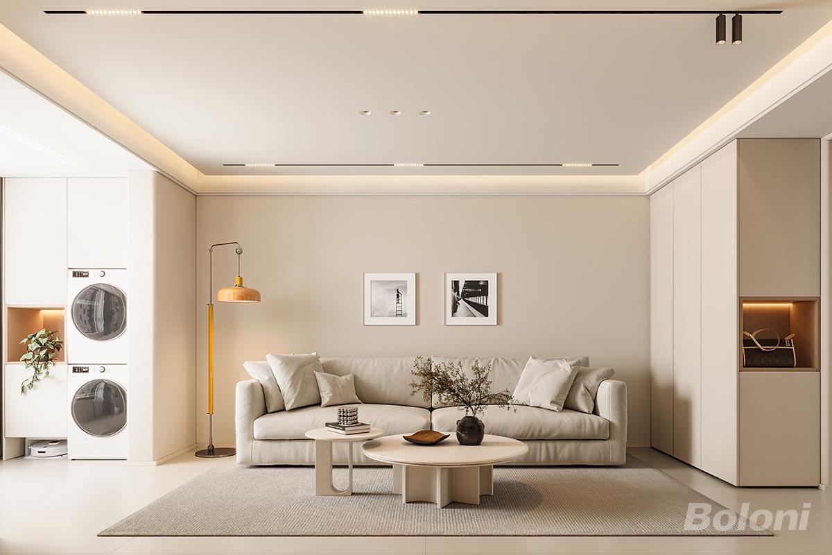 柔和治愈的色彩氛围:以米白、浅杏、暖灰为主调,低饱和度配色弱化了视觉压迫感,营造出干净、温暖、松弛的 “无压感” 空间,适配不同年龄段审美。 极简线条感:无复杂造型与冗余装饰,通过平直柜体、利落顶面线条强化空间通透感,让小户型也能显得开阔大气。 层次丰富的光影:无主灯设计 + 线性灯槽 + 氛围灯带,既保证了基础照明,又通过暖光层次提升温馨感,避免了传统主灯的单调与压抑。