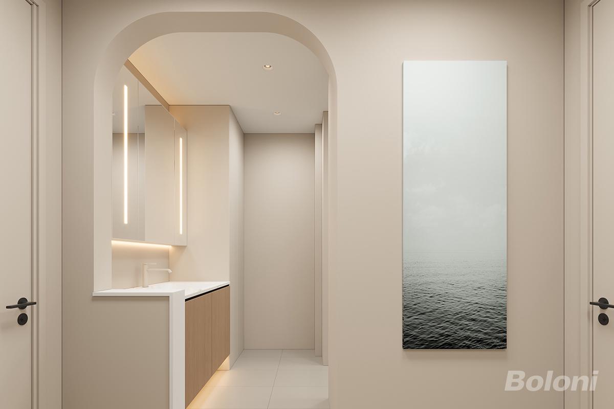 奶油风 + 无主灯设计:整体采用柔和的米杏色墙面与木色柜体,搭配暖光氛围灯,营造出温柔、松弛的治愈感,视觉上干净通透,没有繁杂线条。 弧形垭口:弱化了空间的硬朗感,让过渡更柔和,同时提升了空间的精致度与高级感。 2. 功能与布局:动线流畅,实用高效 干湿分离:洗手台独立于卫浴区,避免了潮湿与水汽的干扰,使用更卫生、舒适。 收纳规划:洗手台下方的木色柜门 + 镜柜组合,提供了充足的储物空间,能隐藏杂