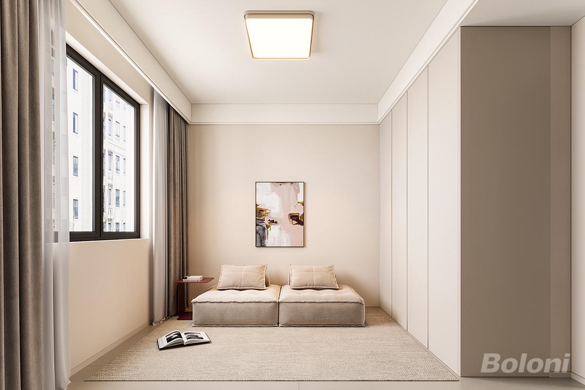 极简利落的线条感:无复杂造型与冗余装饰,通顶柜、平直吊顶、大块面墙面设计强化空间通透感,让小空间也显得开阔整洁,避免压抑感。 层次丰富的光影:顶面主灯 + 自然采光组合,既满足基础照明,又通过窗户引入自然光,搭配双层窗帘,可灵活调节光线强弱,营造不同氛围模块化懒人沙发组合,可拆分、可拼接,适配单人休憩、双人对坐聊天、临时加床等多种需求; 空间无固定家具限制,可轻松切换为阅读角、亲子游戏区、临时观影