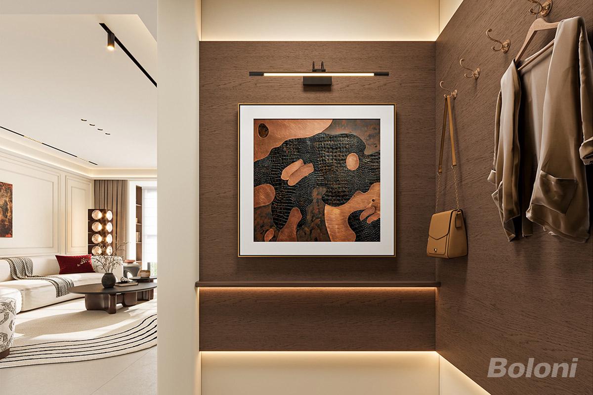 色彩与材质 以奶白墙面 + 深胡桃木饰面为基底,延续全屋 “温柔 + 复古” 的调性,木饰面的温润质感中和了白色的清冷。 地面采用浅灰柔光砖,与客餐厅地面完全一致,保证空间视觉连贯。 局部点缀金属铜色挂钩、暖光灯带、艺术画,提升精致感与复古氛围。 功能与收纳设计 挂衣区:右侧墙面设置铜色挂钩与木质挂衣杆,方便临时悬挂外套、包包,兼顾实用与展示。 悬浮置物台:中部设计悬浮式木饰面台板,下方暗藏暖光灯