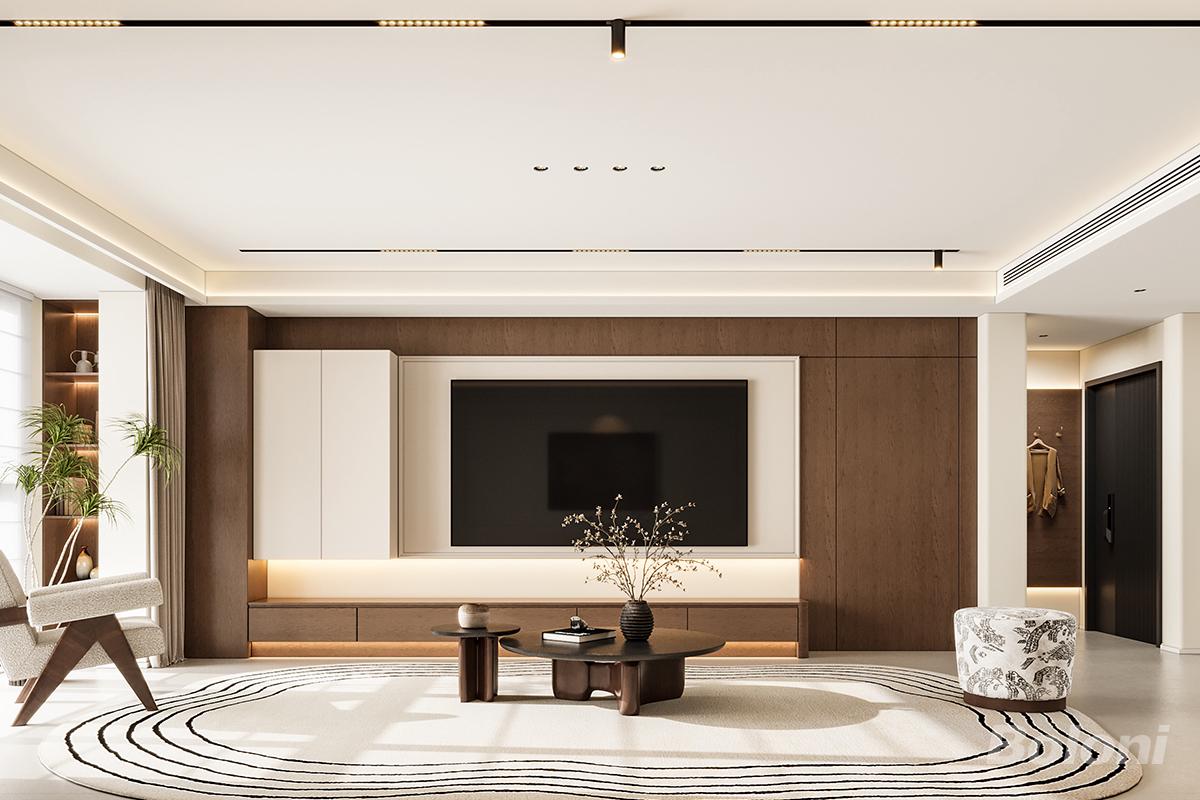 色彩与材质 以奶白 + 深胡桃木为主色调,木饰面的温润质感与白色柜体的简洁形成平衡,弱化了厚重感。 地面采用浅灰柔光砖,顶面为同色系乳胶漆,保证空间通透干净。 软装延续了黑白曲线纹样地毯、米色布艺单椅与木质家具,风格统一。 电视背景墙设计 木饰面 + 悬浮柜体:整面深胡桃木饰面打底,中间嵌入白色悬浮电视柜与封闭收纳柜,视觉上整洁大气。 暗藏灯带:电视柜下方预留灯带槽,暖光氛围灯提升夜间氛围感,同时