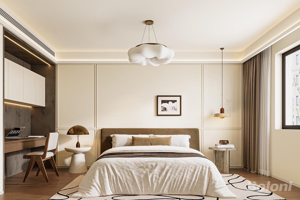 色彩与基底 以奶白色墙面 + 浅橡木地板为核心,奠定温柔治愈的基调,视觉上更显明亮通透。 深胡桃木床头与家具作为复古质感锚点,平衡浅色空间的轻盈感,呼应全屋中古风元素。 局部点缀暖棕、脏粉、金属铜色,让层次更丰富却不杂乱。 硬装与线条 床头墙采用简约石膏线框造型,与主卧、客厅的墙面设计形成呼应,保证全屋风格连贯性。 顶面为无主灯 + 线性灯带设计,搭配嵌入式空调出风口,简洁精致且不压抑。
