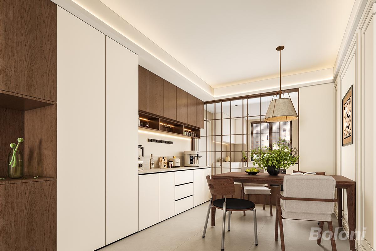 色彩与材质 以奶白 + 深胡桃木为主色调,延续全屋风格:白色柜体清爽干净,木饰面带来温润复古感。 地面采用浅灰柔光砖,与客厅地面一致,保证空间视觉连贯。 局部点缀金属、布艺、绿植,丰富层次且不破坏整体调性。 柜体与收纳设计 高柜 + 地柜 + 吊柜组合:左侧高柜可做隐藏式收纳(如冰箱、杂物),中间地柜 + 吊柜形成操作区,收纳容量充足。 开放格 + 灯带:吊柜下方预留开放酒架 / 置物
