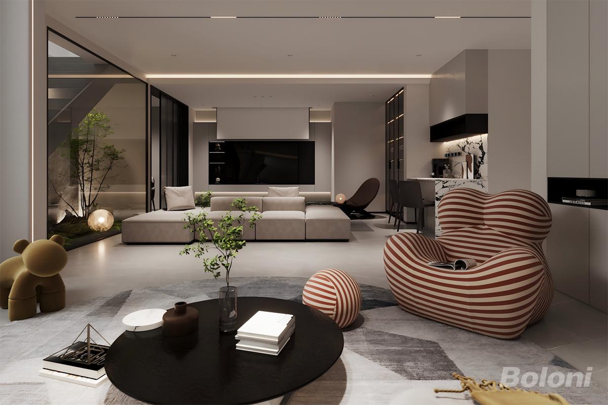 趣味雕塑、条纹艺术单椅与绿植点缀其间,在简约基调中注入灵动与温度;通顶收纳柜与留白墙面平衡了实用与审美,践行 “少即是多” 的现代设计哲学。