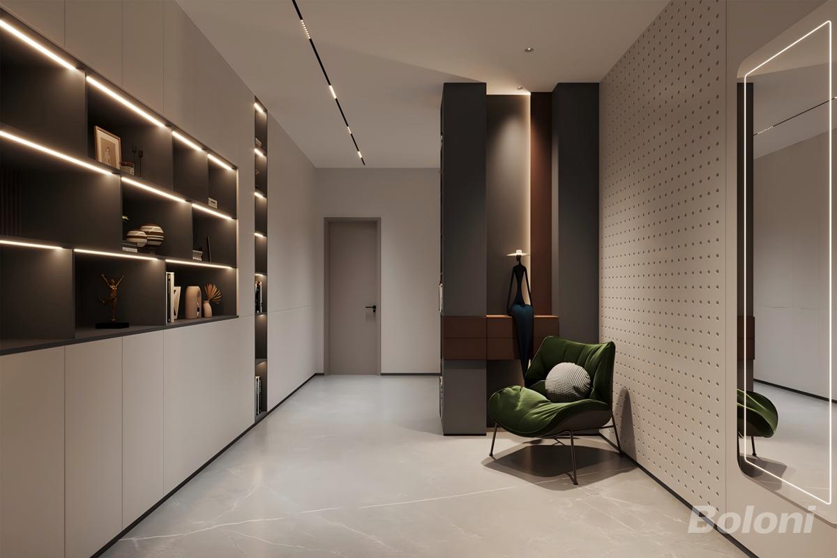 左侧通顶收纳展示柜,将储物与陈列功能结合,灯带勾勒出立体层次右侧设置休闲单椅与洞洞板,打破走廊的单调感,实现 “过渡 + 展示 + 休憩” 的多元场景。
