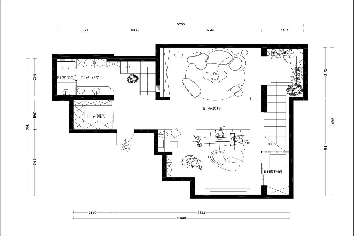 B1:高收纳配置(衣帽间 + 储物间)解决地下空间的储物痛点,提升空间利用率。开放式会客厅布局,契合现代家庭对休闲社交的需求,让地下空间成为生活的延伸场域