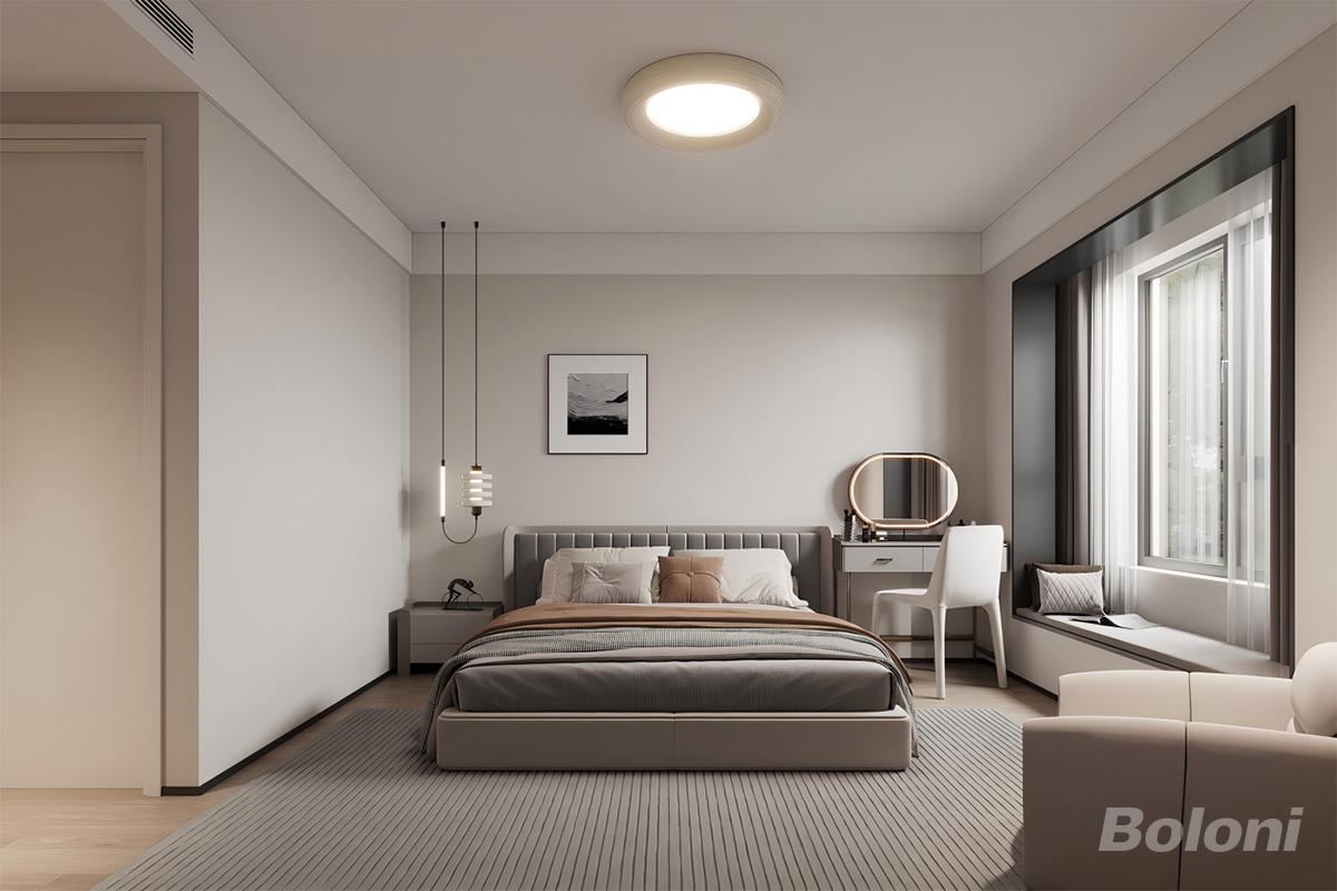 以米白、浅灰为基调,搭配暖棕床品与浅木色地板,弱化视觉冲突,营造温润柔和的氛围;哑光墙面与细腻织物的碰撞,让空间更具层次与温度。
