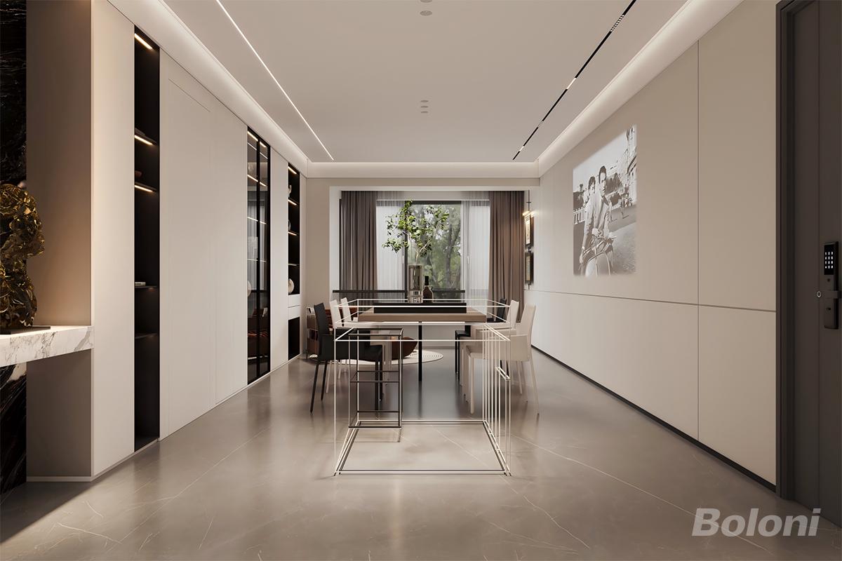 整面无把手隐形门与嵌入式柜体形成统一立面,弱化视觉干扰,强化空间纵深感;中岛与长桌的组合,模糊了餐厨与社交的边界,符合当代开放型生活方式。
