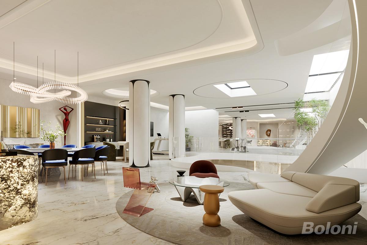 以流畅的弧形动线串联功能区,通高采光与通透玻璃消弭边界,艺术装置与隐藏光源点缀,打造兼具秩序感与高级感的复合空间。
