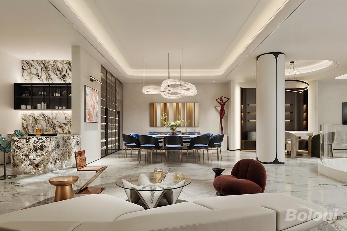 以奢石吧台与环形吊灯打造视觉焦点,低饱和基调融入蓝、红软装点缀,动线流畅,营造兼具艺术感与质感的轻奢公区。