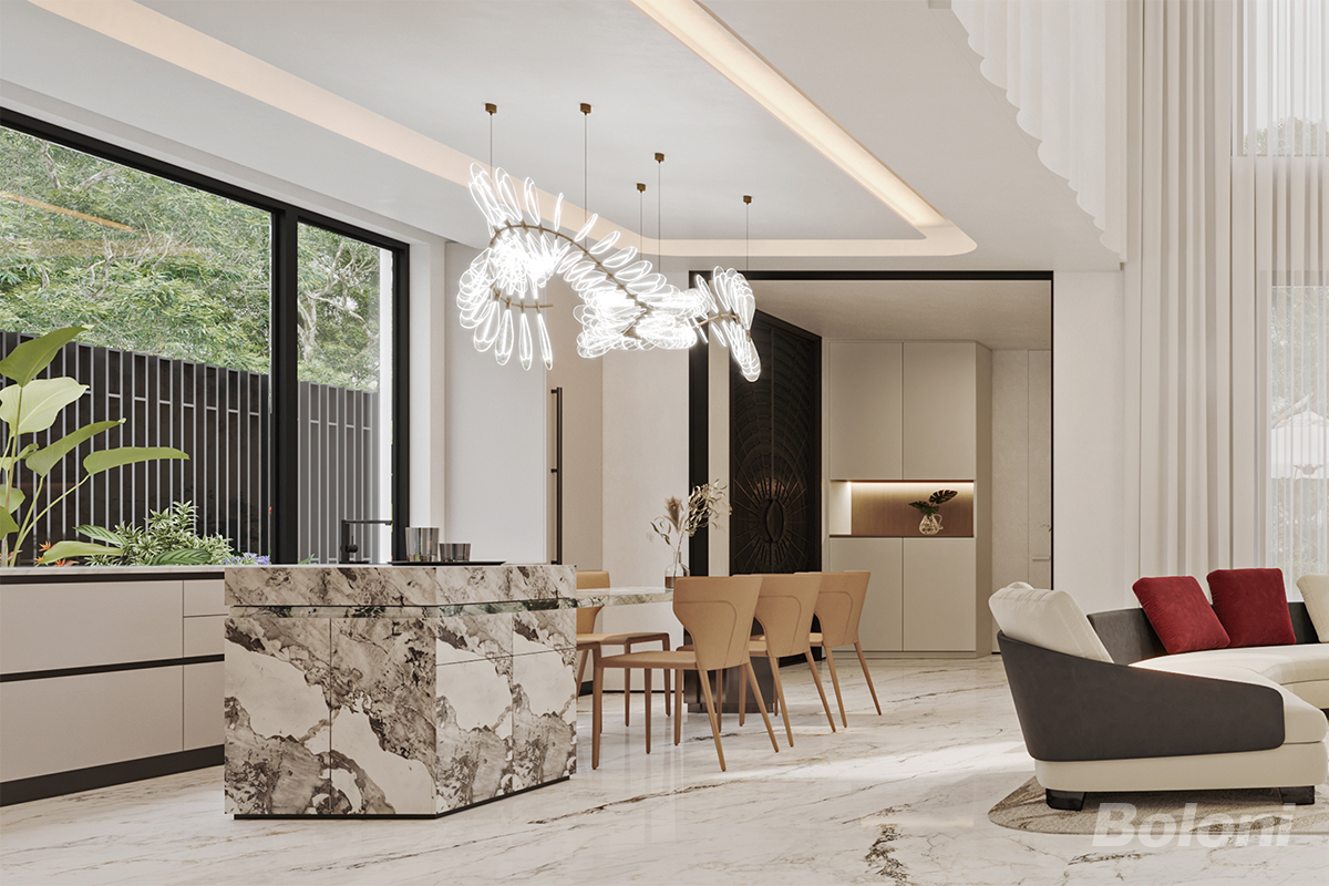以奢石岛台与艺术吊灯为视觉焦点,温润木色与高级白调交织,大面采光引入自然,打造通透优雅的餐厨一体化空间。