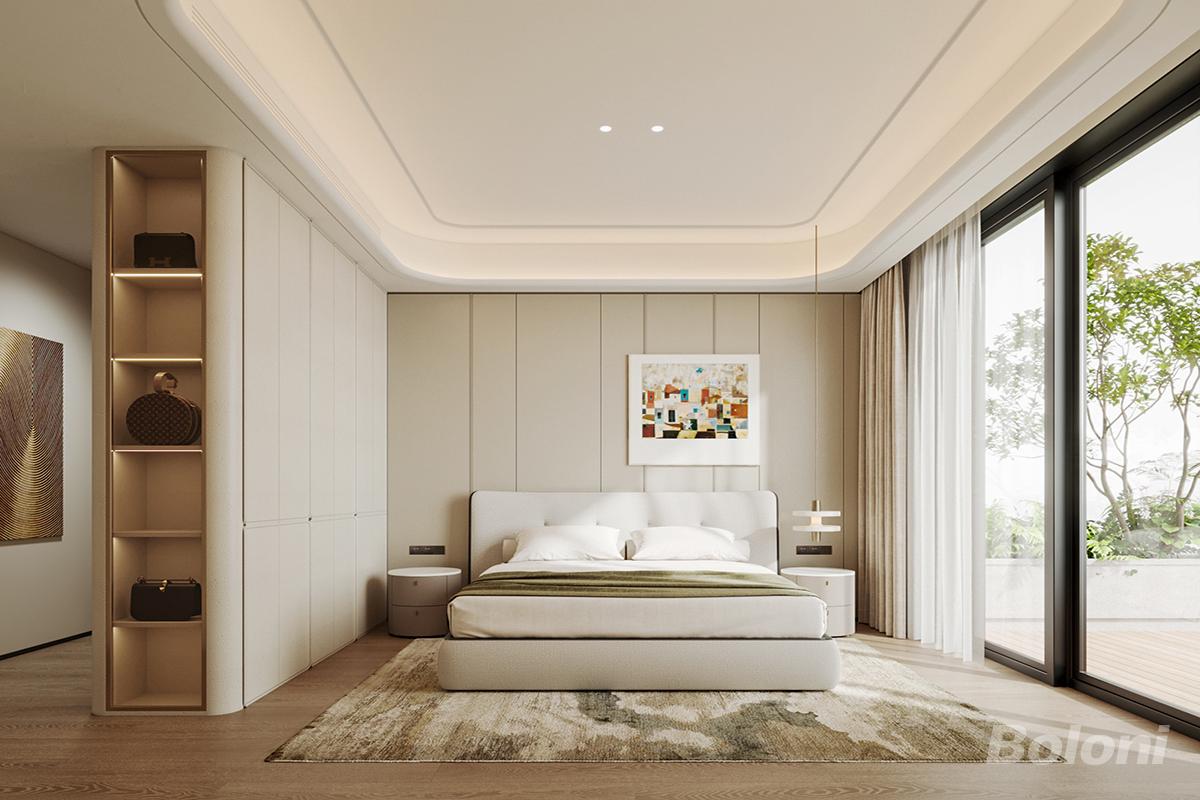 以柔和弧面线条勾勒空间轮廓,低饱和暖调营造静谧氛围,软包与木饰面碰撞温润质感,无主灯与隐式收纳,于细节诠释轻奢高级感。