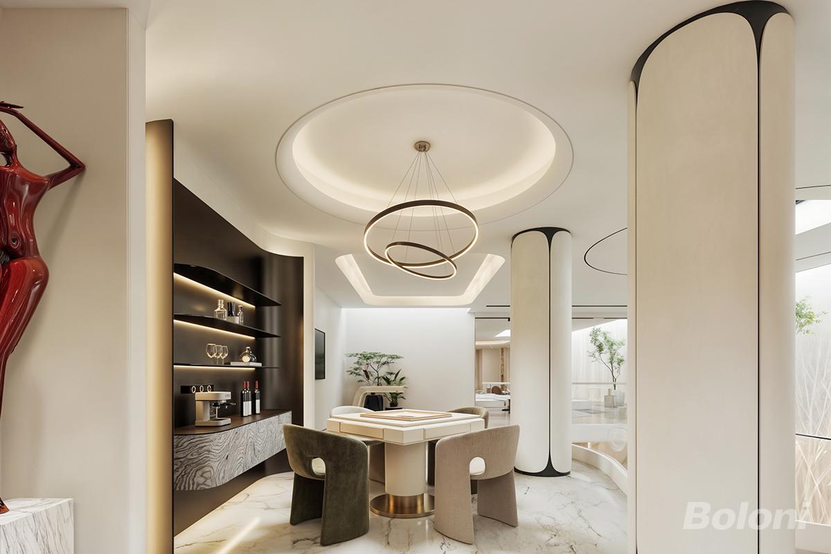 以纯白为基底,通过弧形线条与艺术装置打造流动感空间,无主灯与天窗引入柔和光线,营造通透优雅的轻奢公区氛围。
