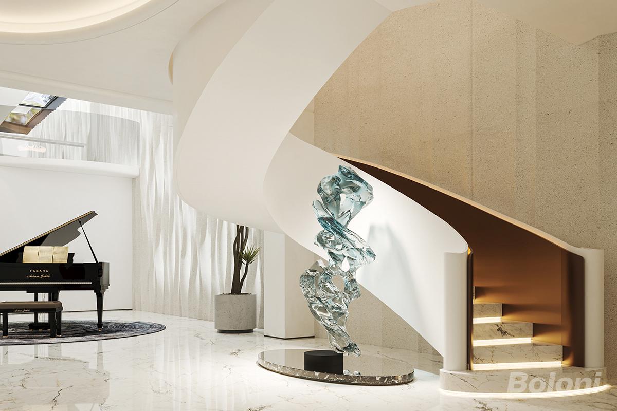 以纯白弧形楼梯为视觉核心,搭配艺术雕塑与暖光氛围灯,结合钢琴区的静谧感,打造流动且富有高级质感的空间叙事。