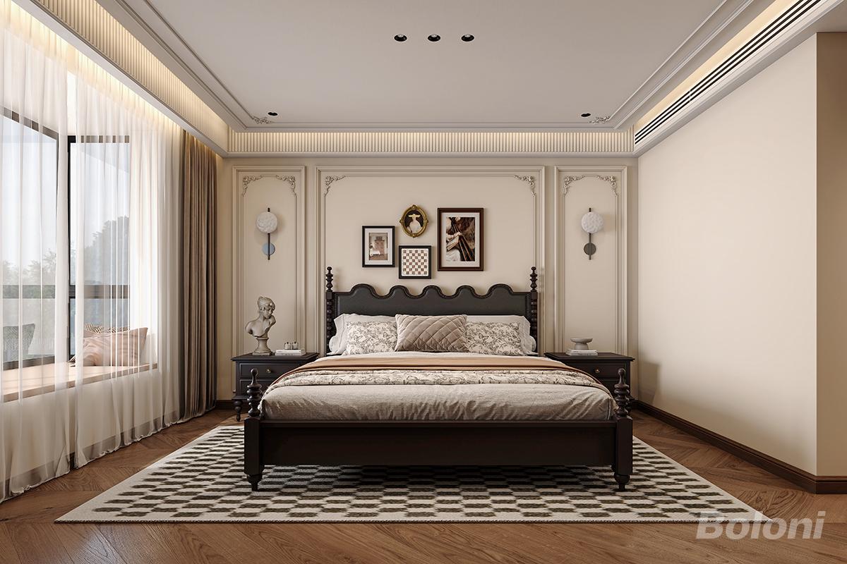 本卧室空间以法式复古风为设计内核,打造兼具浪漫优雅与静谧舒适的休憩雅境。整体色调选用温润的奶咖色与深胡桃木色碰撞,奠定高级且温馨的基底氛围。 背景墙运用精致的石膏线条勾勒边框,搭配中心区域的艺术挂画组合,辅以复古壁饰点缀,极具法式装饰艺术气息,同时赋予墙面灵动的层次与立体感。空间核心的深色实木床具,配以波浪形床头雕花设计,尽显复古精致感;搭配带有纹理感的床品及柔软抱枕,提升睡眠舒适度。