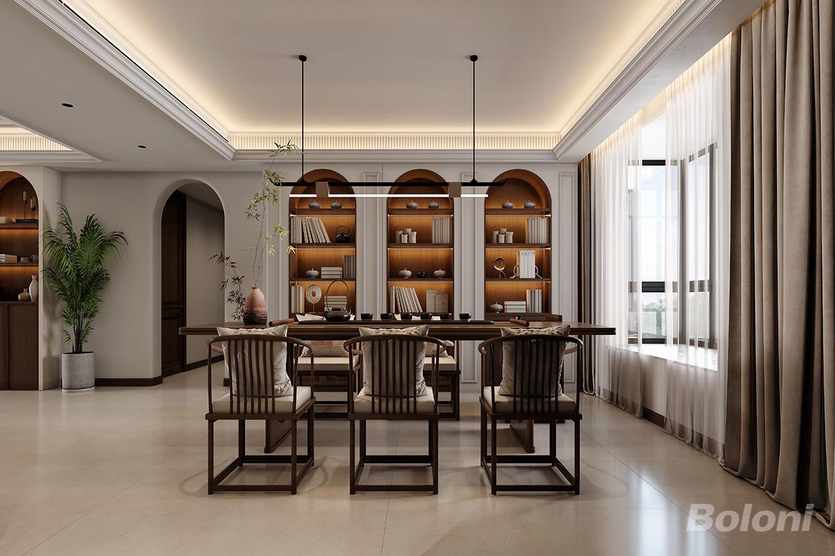 本空间以新中式风格为设计核心,融合东方雅致美学与现代居住需求,打造兼具格调与温度的用餐 / 休闲雅境。整体空间以温润胡桃木色与米白色为基底,通过多层级吊顶设计搭配线性吊灯,塑造出柔和且富有层次的光影氛围,弱化空间硬朗感的同时,传递出优雅大气的东方气韵。 背景墙左侧采用拱形开放格与封闭式柜体结合的设计,兼具收纳与展示功能,规整陈列书籍、摆件,提升空间利用率与层次感。