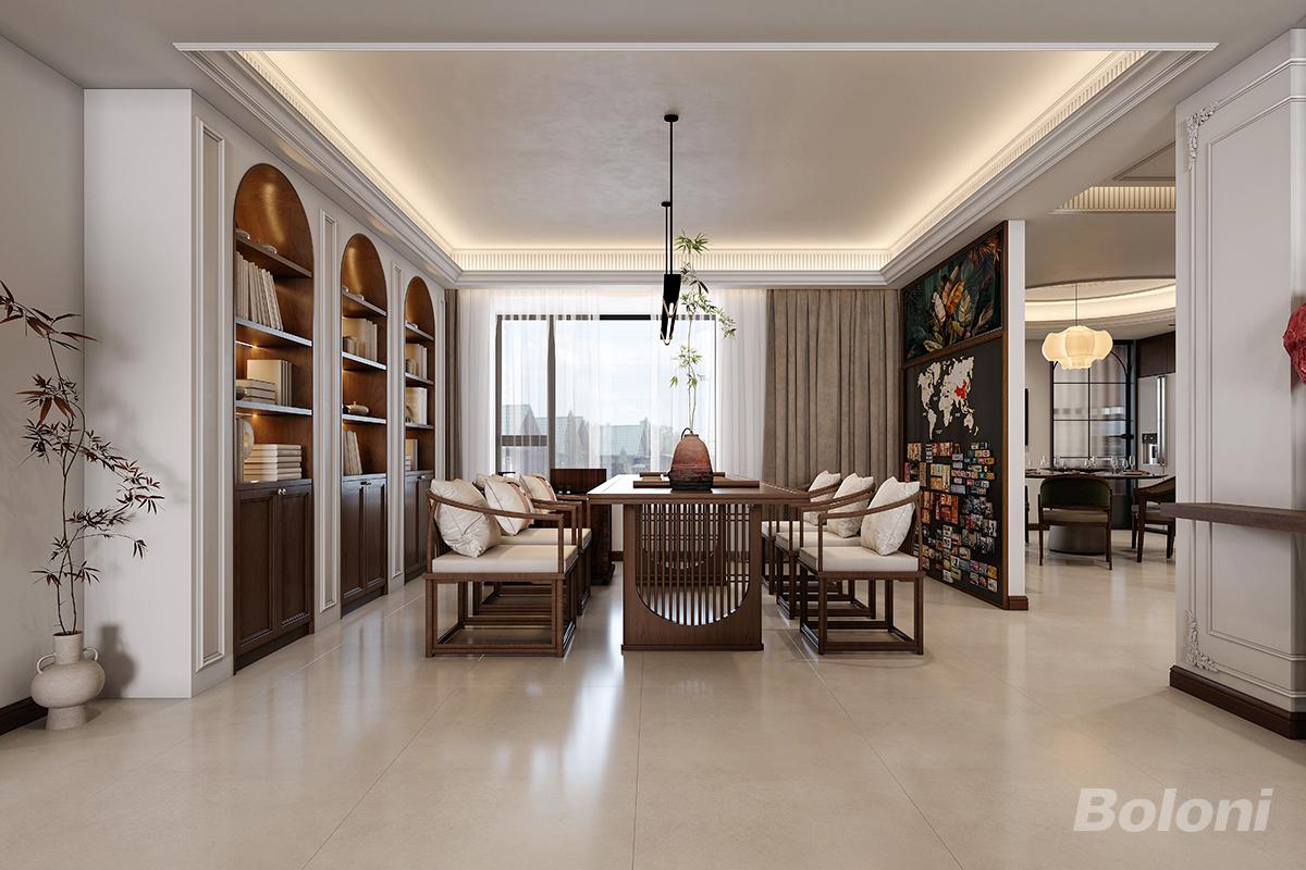 本设计融合法式浪漫与中式雅致,客厅以石膏线条搭配复古皮质家具,勾勒优雅氛围感;茶室以实木家具与满墙书柜打造静谧东方意境,实现复古美学与实用功能的平衡