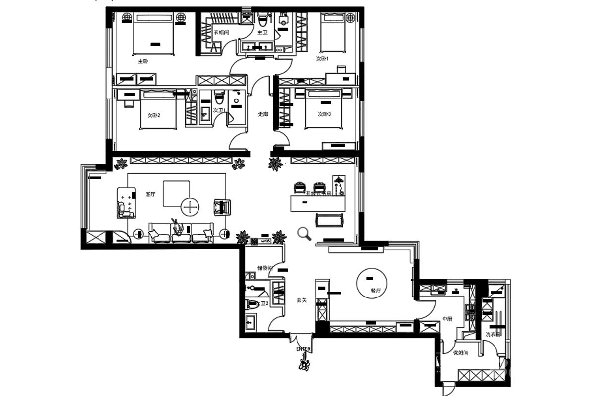 本方案以全家庭长效居住为核心,遵循动静分区、公私分离原则,打造高效舒适的生活体系。入户玄关 + 储物间实现归家缓冲与杂物收纳,提升仪式感;客餐厅为公共核心,串联中西厨,打造开阔社交场域,满足欢聚需求。 私区沿走廊布局,主卧套房配独立衣帽间与主卫,保障极致私密;三间次卧围绕次卫分布,适配多孩 / 长辈居住;独立家政间与洗衣房,分离家务与生活动线,打造适配全家庭成长周期的理想居所。