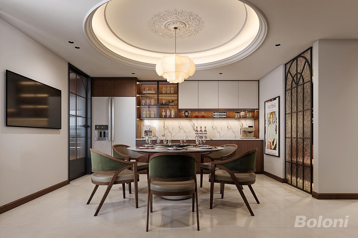 本餐厅空间以美式复古风为基调,巧妙融合法式浪漫元素,打造兼具精致感与烟火气的用餐雅境。整体设计以温润胡桃木色与奶白色为基底,搭配大理石纹台面,奠定高级温馨的空间基调。 顶面采用圆形双层石膏线吊顶搭配中心雕花装饰,配合花瓣造型艺术吊灯,极具视觉焦点与复古仪式感。空间布局兼顾实用与美感,餐边柜整合了收纳与展示功能,通过玻璃柜门与开放格设计,规整陈列酒具与藏品。