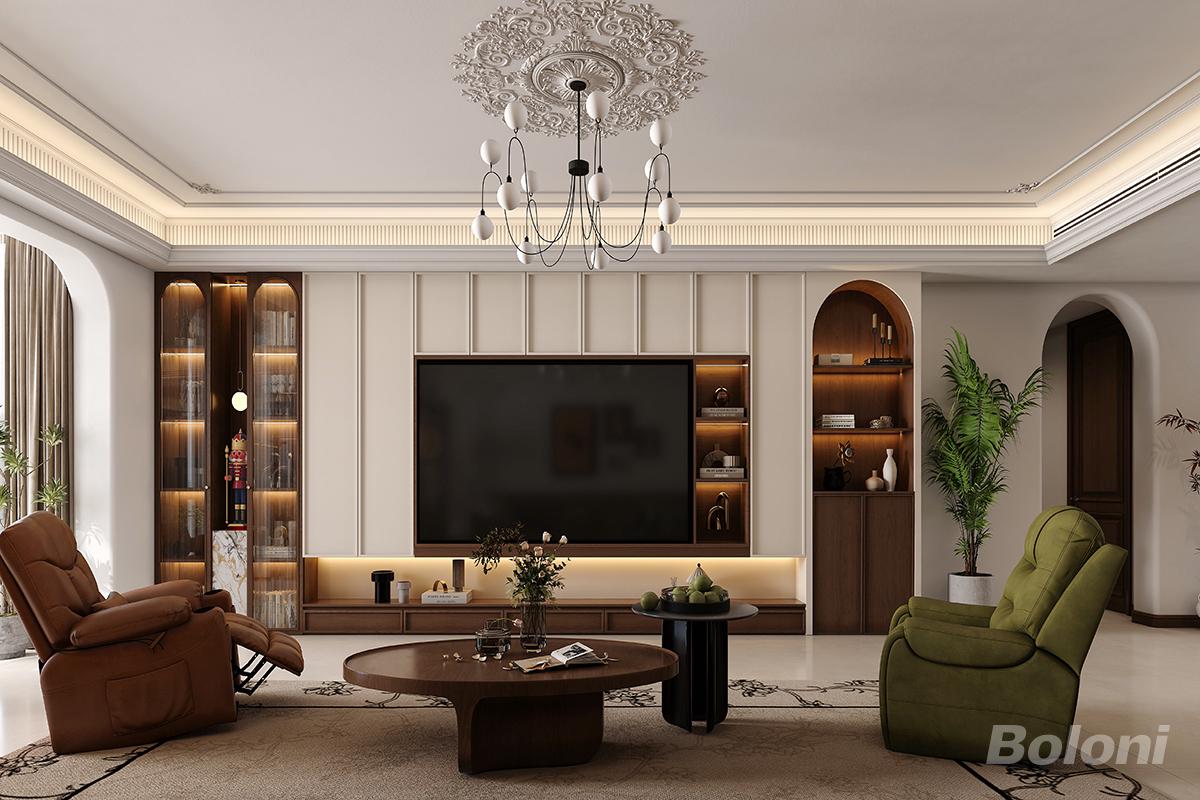 本案客厅以美式复古风为核心,融合现代舒适感,打造兼具美学与温度的居家空间。整体以温润胡桃木与奶白色为基调,搭配石膏雕花吊顶、弧形垭口等经典元素,勾勒出优雅复古的空间轮廓。电视背景墙采用木作与开放格结合的设计,既满足收纳展示需求,又通过暗藏灯带营造层次氛围。空间中融入焦糖色与橄榄绿的功能单椅,为中性空间注入鲜活质感,搭配自然绿植与复古吊灯,在柔和光影中平衡了复古氛围与现代居住的舒适感。
