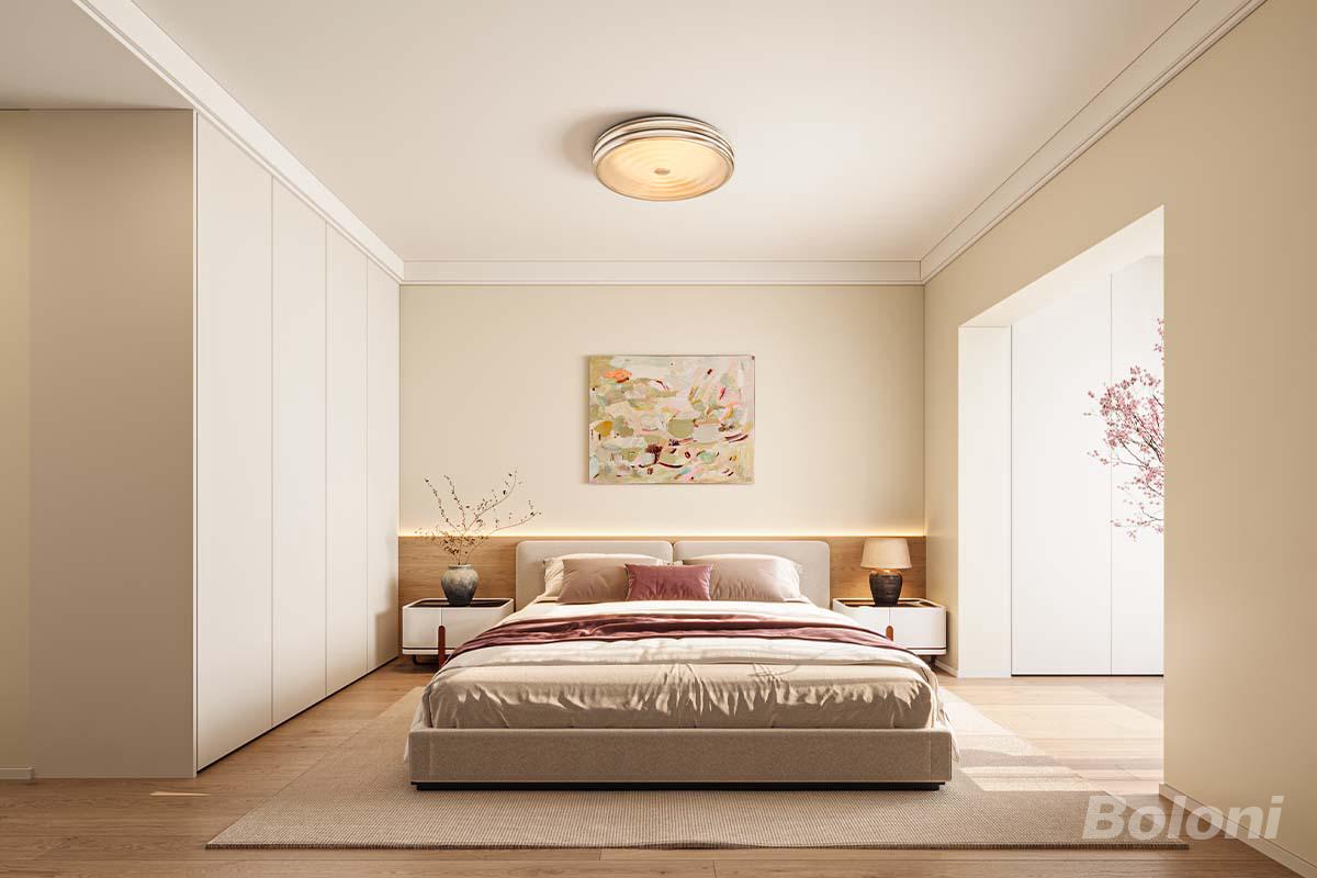 以温润奶白与原木为基调,通顶衣柜最大化收纳,床头氛围灯营造柔和光影。艺术挂画点缀,打造静谧松弛、舒适治愈的睡眠空间。