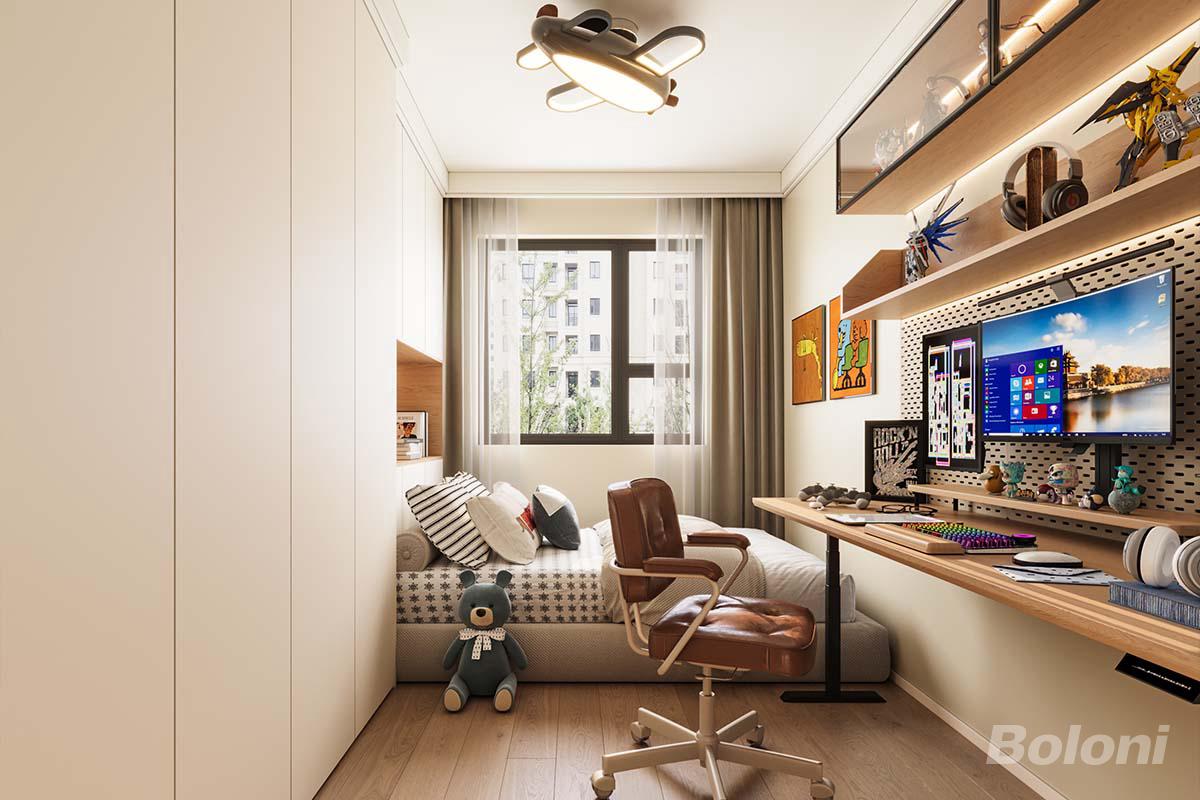 以原木温润为基调,定制洞板书桌与展示柜,兼顾学习与手办收纳。通顶衣柜扩容,童趣软装点缀,打造活泼治愈、适配成长的多功能空间。