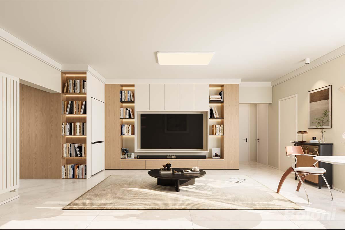 以原木与奶白为基调,定制一体化电视墙书柜,兼顾藏书与收纳。无主灯营造柔和氛围,打造通透雅致、兼具展示与休闲的家庭核心空间。