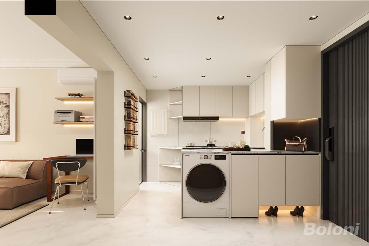 以极简奶白为基调,定制一体化橱柜,整合洗衣、烹饪与入户收纳功能。无主灯营造明亮氛围,打造通透实用、动线流畅的多功能餐厨空间。