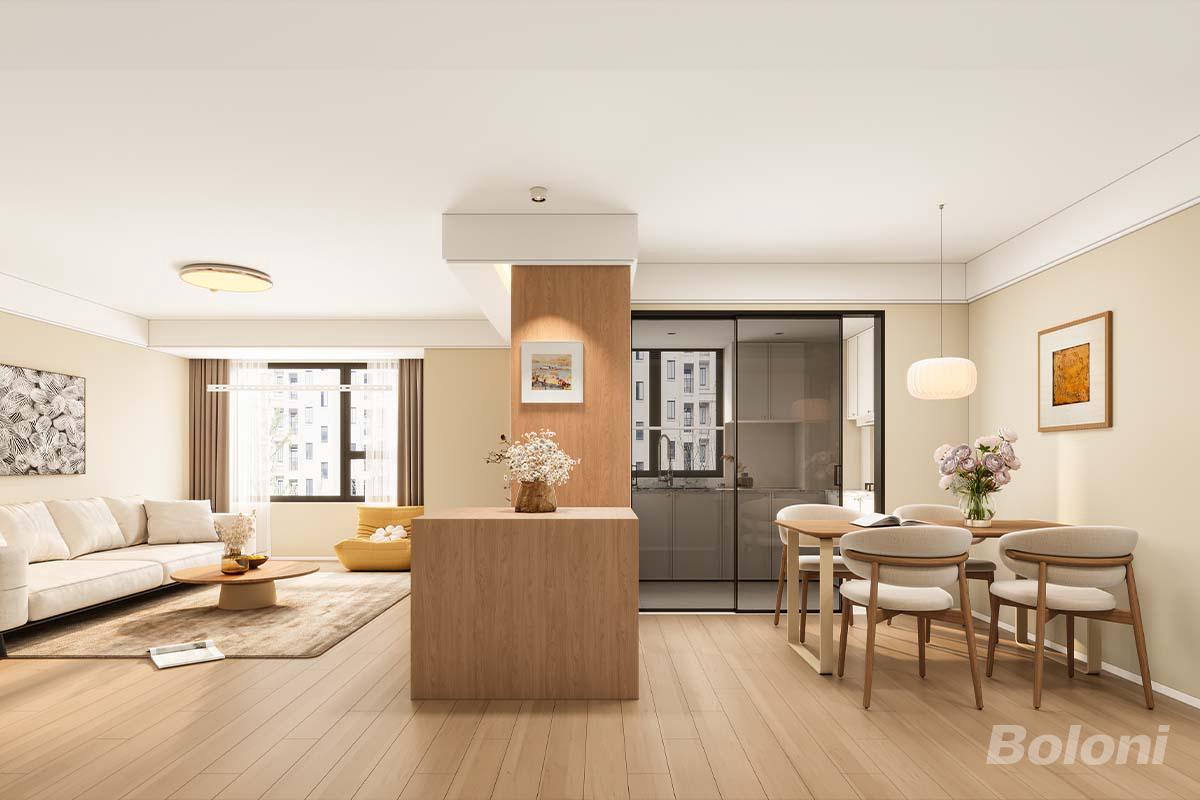 以温润原木与奶白为基调,中岛弱化梁柱、划分客餐,玻璃移门隔而不断。大窗引光入室,艺术挂画点缀,打造通透松弛、动线流畅的家庭核心空间。