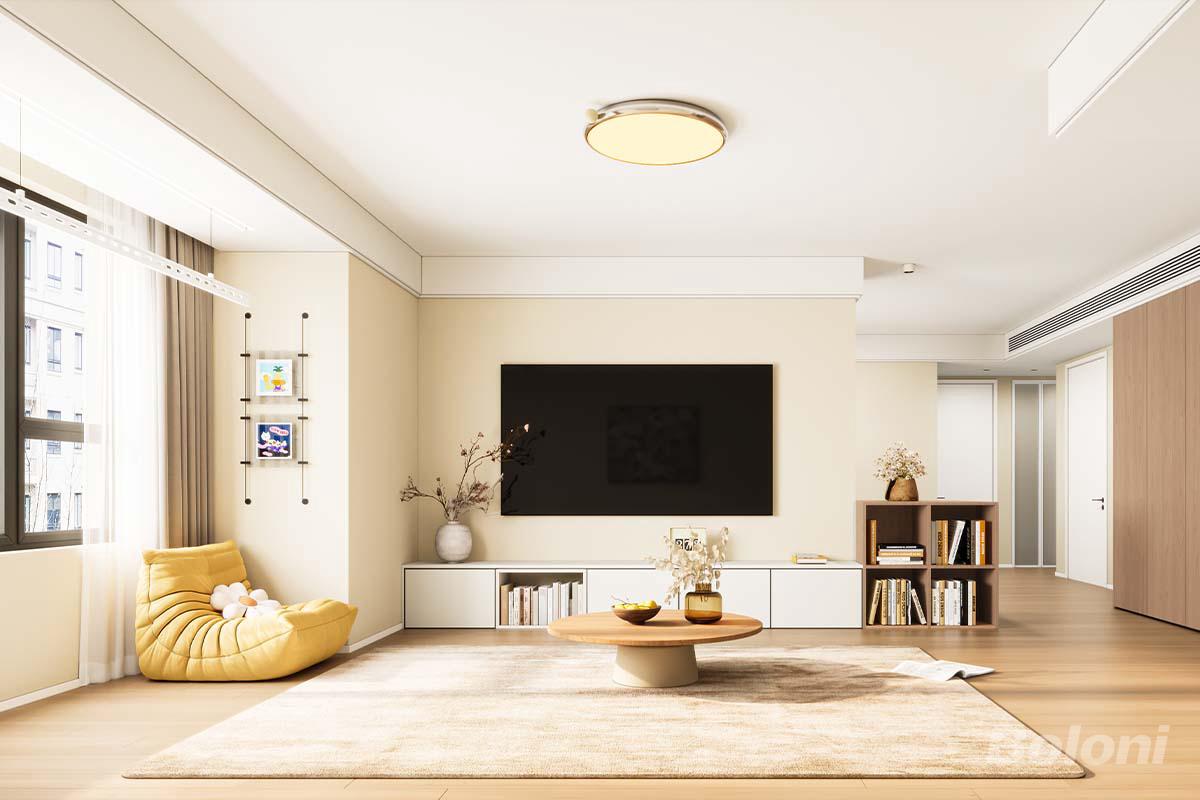 以温润奶白与原木为基调,极简电视墙搭配悬浮收纳柜,打造通透视觉。童趣软装点缀,柔和灯光营造氛围,打造温馨治愈、灵动松弛的家庭互动空间。