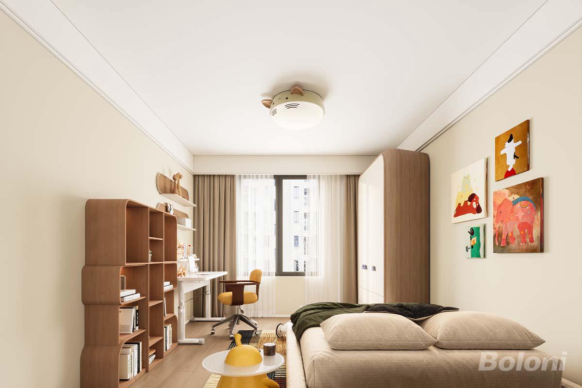 以温润原木为基调,定制开放式书柜与书桌,兼顾学习与收纳。童趣软装与艺术挂画点缀,打造活泼治愈、适配成长的多功能空间。