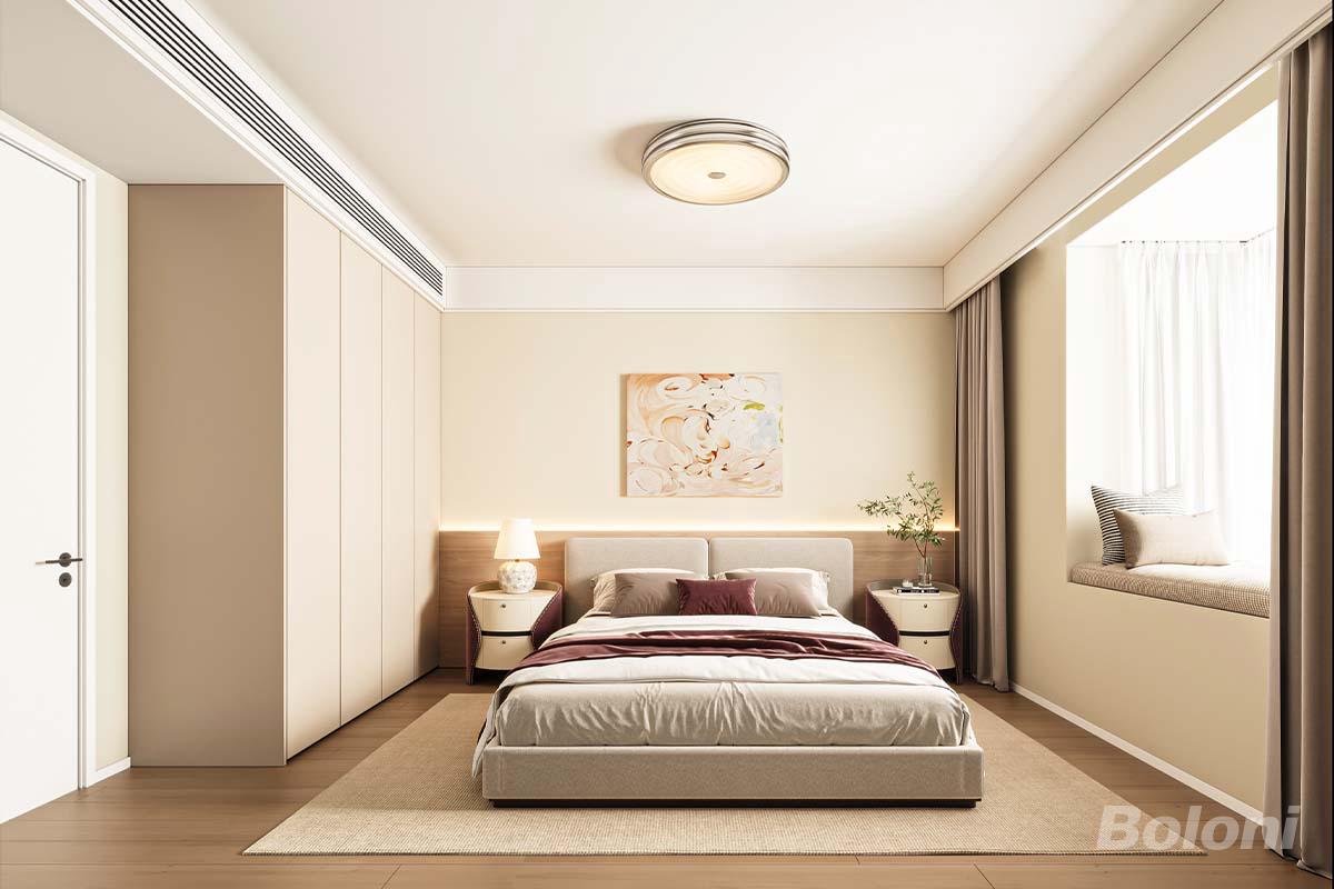以温润奶白与原木为基调,通顶衣柜最大化收纳,床头氛围灯营造柔和光影,飘窗拓展休闲区,打造静谧松弛、治愈舒适的睡眠空间。