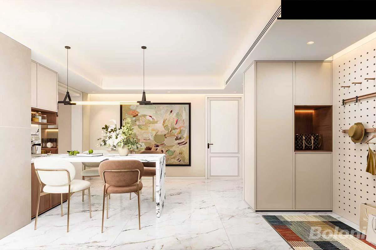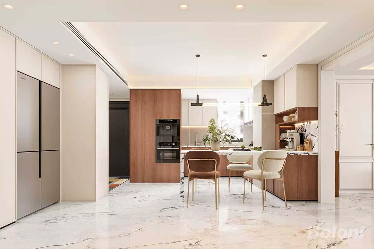 以温润奶白与原木为基调,岛台餐桌一体串联餐厨,通顶柜最大化收纳,无主灯营造柔和氛围,打造动线流畅、温馨治愈的全功能餐厨空间。